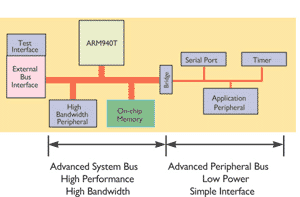 Рис. 2. Блок-схема прибора, реализованного на основе ядра ARM940T. Как и в ранее приведенном примере шина периферии соединяется с системной шиной (в данном случае ASB) посредством моста.