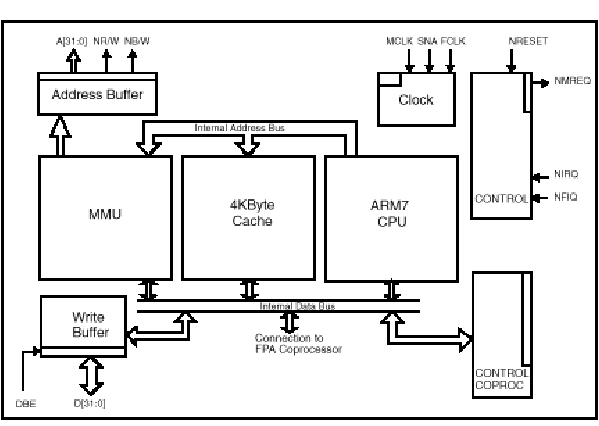 Общим для всех трех микропроцессоров является использование ядра ARM7, встроенного единого кэш команд и данных емкостью 8 Кбайт (ARM7100) и 4 Кбайт (ARM7500 и ARM7500FE), MMU, буфера записи, наличие режимов энергосбережения.