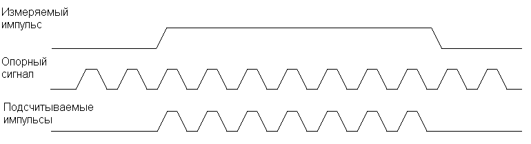 Рисунок 9. Программа измерения длительности импульсов Если теперь на вход микроконтроллера INT0 подать импульс с неизвестной длительностью, то в регистрах TH0 и TL0 будет записана его длительность в микросекундах. Использование таймера в качестве частотомера. Известно, что измерение частоты можно произвести, подсчитав количество периодов неизвестной частоты за единицу времени. Принцип измерения частоты иллюстрируется рисунком 10.