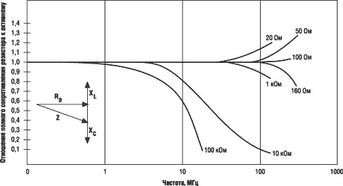 В данной схеме Cв1 и Cв2 — это емкости выводов резисторов относительно общего провода, CR — емкость между выводами резистора, Rr — сопротивление резистивного слоя, Rк — сопротивление контактов, Rиз — сопротивление защитного покрытия (обычно стекло), LR — индуктивность выводов резистора и его резистивного слоя. Наиболее вредным параметром является паразитная индуктивность. Немного меньшее значение играет паразитная ёмкость резистора. Оба этих параметра ограничивают максимальную частоту, до которой можно применять конкретный тип резистора. Наилучшими частотными параметрами в настоящее время обладают резисторы поверхностного монтажа. Именно это в совокупности с их дешевизной и невысокой стоимостью монтажа обусловило то, что в современной аппаратуре применяются резисторы исключительно такой конструкции. На рисунке 2 приведены типовые частотные характеристики резисторов поверхностного монтажа.
