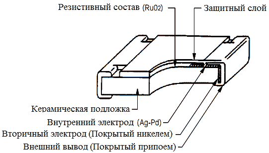 Несмотря на кажущуюся простоту, дешевизну и распространенность, современный резистор поверхностного монтажа является весьма сложным устройством, при изготовлении которого используются многие достижения современных высоких технологий. Для того, чтобы убедиться в этом, достаточно взглянуть на упрощенную схему внутреннего устройства SMD резистора, приведенную на рисунке 4.
