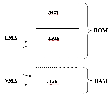 Секцию .data размещают в ROM, а затем, её содержимое переносится в RAM . Таким образом, перед выполнением прикладной программы, нужно выполнить некоторый код инициализации, а так же задать соответственные команды в скрипте линковки. Каждый символ в секции .data будет иметь два различных адреса. Один адрес в области ROM - LMA (Load Memory Address). А другой адрес в RAM - VMA (Virtual Memory Address). Конечная программа будет работать с адресами VMA. Скрипт компоновщика приведён ниже: