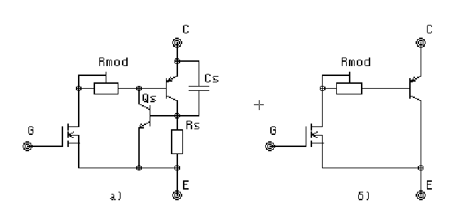 Среди наиболее известных можно также назвать драйверы нижнего плеча МС33153, МС34151 фирмы Motorola и драйверы с гальванической развязкой Hewlett Packard. Все сказанное выше делает транзисторы IGBT в сочетании с микросхема-ми управления оптимальными элементами для построения силовых ключевых каскадов с мощностью до десятков киловатт. Однако указанные элементы имеют и ряд технологических недостатков, ограничивающих область их применения. Среди наиболее серьезных - наличие времени рассасывания базы биполярной части IGBT (хвоста) и способность транзисторов и драйверов к защелкиванию. Причины защелкиванияПричиной защелкивания IGBT транзисторов является наличие триггерной структуры, образованной биполярной частью IGBT и паразитным NPN транзистором. Эквивалентная схема, учитывающая подобный эффект, показана на рис.1а. Такую эквивалентную схему приводили в своей документации многие фирмы, в частности, SIEMENS, TOSHIBA, FUJI и другие. Наличие триггерной структуры приводит к тому, что при определенных условиях работы, когда напряжение на паразитном резисторе Rs превышает некоторое пороговое значение, транзистор Qs открывается, триггер опрокидывается и происходит защелкивание. Последствием этого, как правило, является лавинообразный выход прибора из строя. Повышение напряжения на Rs происходит либо вследствие резкого возрастания тока (например при коротком замыкании), либо из-за большой скорости нарастания напряжения (когда фронт напряжения дифференцируется паразитной емкостью Cs).