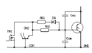 Рис. 2Из приведенной схемы видно, что, если выходное напряжение драйвера Vout станет выше напряжения питания Vcc (или ниже Vcom) на величину отпирания биполярного транзистора Vbe, то откроется один из паразитных биполярных транзисторов, и защелкнется триггер, закоротив питание драйвера. Ток, протекающий при этом достаточен, чтобы разрушить металлизацию интегральной схемы. Благодаря структуре выходного каскада и наличию внутренних диодов КМОП транзисторов, драйверы способны противостоять защелкиванию до определенных значений наведенного тока. Например, драйверы серии IR21XX не защелкиваются при наведенном на выход токе до 0,5А. Кроме того, из-за низких частотных характеристик паразитных транзисторов, выходной каскад может не защелкнуться при длительности наведенного импульса менее 1мкс. Следует также отметить, что ток защелки имеет отрицательный температурный коэффициент. В документации по применению драйверов многие фирмы указывают максимальную скорость нарастания напряжения (dV/dt immunity) , которую способен выдерживать драйвер. Для драйверов фирмы International Rectifier эта величина составляет ±50V/ns. Это говорит о том, что при более высоких скоростях нарастания, фронт напряжения, продифференцированный паразитной емкостью, может вызвать смещение выходного напряжения драйвера на указанную выше величину и, следовательно, повлечет за собой срабатывание триггерной структуры. Таким образом, правильное включение каскадов управления и силовых транзисторов имеет важное значение для обеспечения надежности. Методы исключения защелкиОсновное, на что надо обращать внимание при разработке топологии вы-ходного каскада - это правильное подключение цепей питания и общего провода. Ни при каких условиях силовые токи не должны протекать по цепям управления затвором. Вывод COM драйвера должен быть связан непосредственно с эмиттером IGBT (или истоком МОП ПТ). Соединение драйвера с затвором и эмиттером должно быть выполнено прямыми линиями минимальной длины. Если нет возможности установить транзистор на печатную плату, то провода цепи управления необходимо сделать бифилярными и прямыми. Высоковольтный конденсатор питания должен быть установлен максимально близко к силовому транзистору и иметь выводы с минимальной индуктивностью. International Rectifier указывает, что при суммарной индуктивности выводов 100нГ пе-ренапряжение в момент переключения может достигать 200В.Для борьбы с перенапряжением ряд фирм выпускает конденсаторы с полосковыми низкоиндуктивными выводами. Для ограничения dV/dt, которое может вызвать защелку из-за емкости Миллера, можно увеличивать резистор затвора Rg, однако при этом будут возрастать потери переключения. Можно также использовать RC цепи формирования траектории переключения (например, см. рис.3).