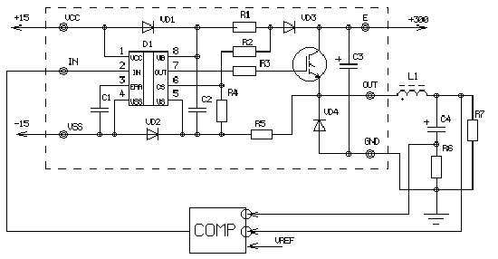 Рис. 5Схема, приведенная на рисунке, представляет собой ШИМ регулятор напряжения. Выход компаратора COMP управляет входом драйвера. На его инвертирующие входы подаются сигналы обратной связи с выхода регулятора и с резистора R6, измеряющего ток заряда конденсатора сглаживающего фильтра. Сигналы обратной связи сравниваются с опорным напряжением Uref. Таким образом, на нагрузке поддерживается постоянное напряжение, а зарядные токи конденсатора не приводят к срабатыванию защиты. Питание схемы производится от выпрямленного сетевого напряжения 220В. Ток, потребляемый нагрузкой R7, не превышает 10А.