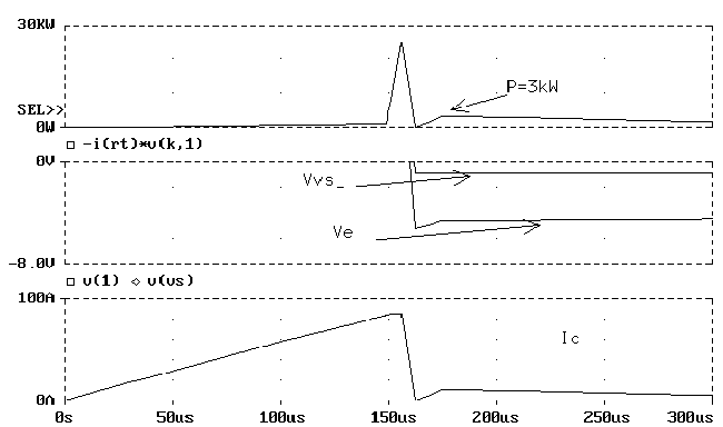Рис. 6Однако при включении этой схемы неоднократно наблюдались процессы, сходные с защелкиванием и приводившие к выходу из строя как драйвера, так и силового транзистора, хотя все указанные выше требования были соблюдены. Причину происходящего помогают объяснить эпюры, полученные при моделировании схемы с помощью программы PSPICE (см. рис.6). Для анализа были разработаны макромодели драйвера IR2125 и IGBT транзистора, обеспечивающие их характеристики с высокой точностью. На нижней эпюре показан ток коллектора транзистора Ic, начиная c мо-мента включения, когда напряжение на нагрузке нулевое. Он нарастает до величины, ограниченной обратной связью (около 80А), после чего драйвер стремится отключить силовой транзистор. Однако из-за индуктивного характера нагрузки при запирании транзистора открывается диод VD4, ток которого в первый момент имеет такую же величину. Прямое падение напряжения на диоде при таком токе составляет около 5В, то есть напряжение на эмиттере транзистора (Ve) в этот момент - минус 5В. Между тем, потенциал на выходе драйвера такой же, как на выводе VS (Vvs). Его величина ограничена диодом VD2 и не превышает 0,7В. Поэтому транзистор оказывается приоткрыт, и ток через него не прекращается! Это видно из графика Ic. Транзистор выходит из насыщения и мощность, рассеиваемая на нем (около 3кВт) может привести к разрушению кристалла. Как правило, после выхода из строя транзистора повреждается и драйвер. Исключение из схемы диода VD2 устраняет эту проблему, однако появляется вероятность повреждения драйвера из-за отрицательных пиков. Показанный процесс можно назвать схемотехнической защелкой в отличие от защелки технологической. Современные технологии и, в частности, появление транзисторов IGBT, MOSFET нового поколения и драйверов, раскрывает перед разработчиком широчайшие возможности. Использование этих элементов в сочетании с цифроыми контроллерами позволяет строить мощные малогабаритные преобразователи, имеющие высокую надежность. Однако для реализации этих возможностей необходим строгий подход к расчету, разработке схем и конструированию. Только компьютерное моделирование схем, без которого современная разработка немыслима, позволяет учесть все требования по применению новых элементов и обеспечить необходимые режимы работы. 1 - Силовые полупроводниковые приборы. International Rectifier. Воронеж 1995 г.