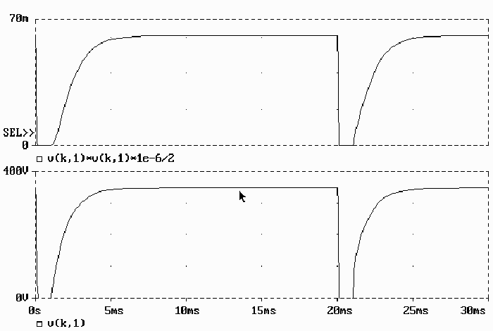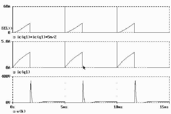 Рис. 3В машинах с классической схемой, где искра формируется за счет прерывания тока в достаточно высокоомной катушке механическим прерывателем, проблем еще больше. Замена механического контакта на электронный их не решает, и применение электронных коммутаторов от “Самар” или им подобных в автомобилях с высокоомной катушкой не дает ничего, кроме снижения токовой нагрузки на контакт. Дело в том, что RL параметры катушки должны удовлетворять противоречивым требованиям. Во-первых, активное сопротивление R должно обеспечивать достаточный ток для накопления необходимого количества энергии при пуске, когда напряжение аккумулятора может упасть в 1,5раза. С другой стороны, слишком большой ток приводит к преждевременному выходу из строя контактной группы. Во-вторых, для увеличения количества запасенной энергии необходимо увеличивать индуктивность катушки, но при этом с ростом оборотов ток в катушке не успевает достигнуть номинального значения. Например, в системах зажигания ВАЗ2101-2107 при частоте вращения коленчатого вала 6000об/мин ток разрыва катушки падает в полтора раза, а мощность, соответственно, более чем в два, что приводит к повышенному расходу топлива. Сказанное иллюстрируется эпюрами, приведенными на рис.2 и 3, где (снизу вверх) показаны напряжение на контакте прерывателя, ток катушки и запасенная энергия. Все эпюры получены при моделировании электронных схем систем зажигания с помощью программы PSPICE. Из графиков видно, что при увеличении частоты вращения вала с 1500об/мин до 6000об/мин (что соответствует частоте искрообразования 50Гц и 200Гц), запасенная в катушке энергия падает с 50мДж до 20мДж. Наиболее полно преимущества электронной системы зажигания проявляются в конденсаторной системе с непрерывным накоплением энергии. Один из вариантов конденсаторной системы зажигания и описан в данной статье. Подобные устройства способны разрешить большинство противоречивых требований, предъявляемых к системе зажигания. В такой схеме высоковольтный конденсатор постоянно подзаряжается от вспомогательного генератора, силовой транзистор подключает заряженный конденсатор к первичной обмотке, а катушка зажигания используется только как трансформатор. Энергию, запасенную в конденсаторе Ecap, можно определить следующим образом: Ecap=C*V2 /2,Где C – емкость, а V – напряжение на конденсаторе, которое выбирается исходя из необходимого напряжения вторичного пробоя. Обычно напряжение на первичной обмотке нормируется на уровне 300-350В. Наличие высокочастотного генератора и стабилизация напряжения делает величину запасаемой энергии независимой от напряжения аккумулятора и частоты вращения вала. Такая структура получается гораздо более экономичной, чем при накоплении энергии в индуктивности, так как ток через силовой транзистор и первичную обмотку катушки течет только в момент искрообразования. Кроме того высоковольтное напряжение на транзисторе стабилизировано и не зависит от напряжения вторичного пробоя, как в индуктивных системах, что повышает надежность работы силового транзистора. На рис.1 приведена упрощенная принципиальная схема блока электронного зажигания с непрерывным накоплением энергии и стабилизацией выходного напряжения. Подзарядка накопительного конденсатора С3 производится от импульсного высоковольтного трансформ