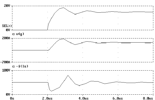 Рис. 2Принципиальная схема и эпюры напряжения, соответствующие этому ре-жиму, приведены на рис. 1а и 2. Все графики получены при анализе реальных схем с помощью программы PSpice. Для анализа били использованы усовер-шенствованные модели транзисторов MOSFET фирмы International Rectifier и макромодели IGBT и драйверов, разработанные автором статьи. Максимальный ток в цепи коллектора транзистора ограничен напряжением на затворе и крутизной транзистора. Из-за наличия емкости в цепи питания, внутреннее сопротивление источника питания не влияет на ток КЗ. В момент включения ток в транзисторе нарастает плавно из-за паразитной индуктивности LS в цепи коллектора (средний график на рис.2). По этой же причине напряжение имеет провал (нижний график). После окончания переходного процесса к транзистору приложено полное напряжение питания, что приводит к рассеянию колоссальной мощности в кристалле. Режим КЗ необходимо прервать через некоторое время, необходимое для исключения ложного срабатывания. Это время обычно составляет 1-10мкс. Естественно, что транзистор должен выдерживать перегрузку в течение этого времени. Принципиальная схема и эпюры напряжения, соответствующие этому режиму, приведены на рис. 1б и 3. Как видно из графиков, процессы в этом случае происходят несколько иначе. Ток, как и в предыдущем случае ограниченный параметрами транзистора, нарастает со скоростью, определяемой паразитной индуктивностью Ls (Средний график на рис.3). Прежде, чем ток достигнет установившегося значения, начинается рост напряжения Vce (нижний график). Напряжение на затворе возрастает за счет эффекта Миллера (верхний график). Соответственно возрастает и ток коллектора, который может превысить установившееся значение. В этом режиме кроме отключения транзистора необходимо предусмотреть и ограничение напряжения на затворе.