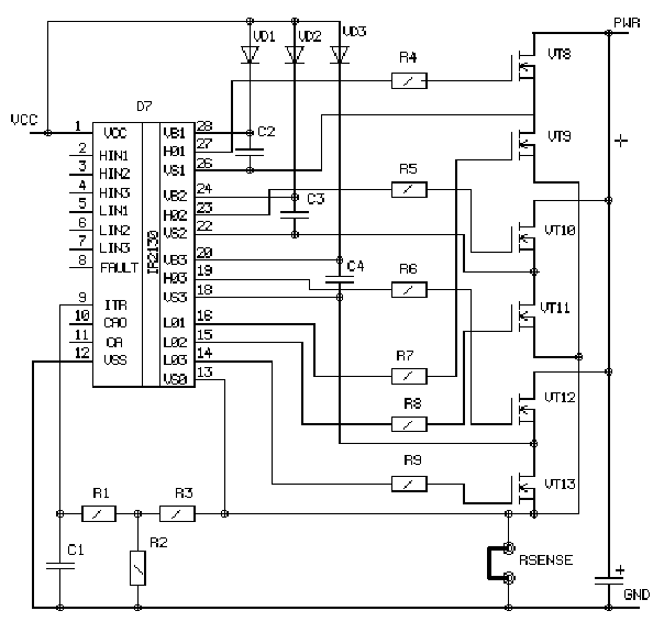 Рис. 5Кроме защиты от перегрузки по току, драйвер анализирует напряжение питания входной части VСС и выходного каскада VB, отключая транзистор при падении VB ниже 9В, что необходимо для исключения линейного режима работы транзистора. Такая ситуация может возникнуть как при повреждении низковольтного источника питания, так и при неправильном выборе бутстрепной емкости С2. Величина емкости С2 должна вычисляться исходя из тока затвора силового транзистора и минимальной частоты следования импульсов. Если возможно пропадание импульсов, необходимо использовать "плавающий" источник питания. Данный способ защиты является наиболее предпочтительным и использовать первую схему целесообразно только тогда, когда нужно точное задание тока защиты. На рис.6 приведена схема подключения драйвера трехфазного моста IR2130 с использованием функции защиты от перегрузки. Для этой цели используется вход ITR. Напряжение срабатывания защиты - 500мВ. Для измерения полного тока моста в эмиттерах установлен резистор RSENSE, номинал которого вместе с делителем R2, R3 определяет ток защиты. Драйвер IR2130 обеспечивает управление MOSFET и IGBT транзисторами при напряжении до 600В, имеет защиту от перегрузки по току и от снижения питающих напряжений. Схема защиты содержит полевой транзистор с открытым стоком для индикации неисправности (FAULT). Он также имеет встроенный усилитель тока нагрузки, что позволяет вырабатывать контрольные сигналы и сигналы обратной связи. Драйвер формирует время задержки (deadtime) между включением транзисторов верхнего и нижнего плеча для исключения сквозных токов. Это время составляет 1-2 мкс. Для правильного использования указанной микросхемы и создания на ее основе надежных схем надо учитывать несколько нюансов.