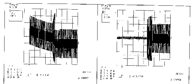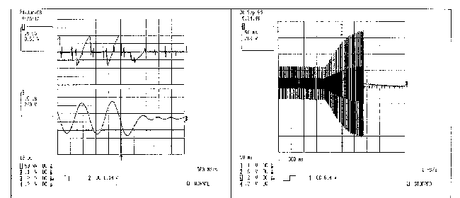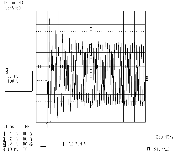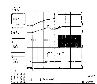 На Рис. 6 представлен график зависимости частоты колебаний в полумостовой схеме от времени для всех нормальных режимов работы: режимов подогрева и поджига линейно изменяющимся сигналом и рабочего режима. Как видно из Рис. 6, существует начальная пусковая частота, значительно превышающая частоту в установившемся режиме подогрева, который быстро завершается. Эта начальная пусковая частота задается элементами C13 и R17. Это сделано, чтобы обеспечить ограничение напряжения на электродах лампы при запуске ниже минимального напряжения поджига лампы. Если при возникновении генерации в полумостовой схеме напряжение на электродах лампы достаточно велико, происходит видимая вспышка в лампе, чего следует избегать. Это режим холодного поджига лампы, который может уменьшить срок ее службы. Осциллограмма напряжения на электродах лампы при запуске приведена на Рис. 7 и 8. На Рис. 7 показано напряжение на лампе без высокой начальной пусковой частоты, в то время как на Рис. 8 показано напряжение на лампе при запуске с высокой начальной частотой.