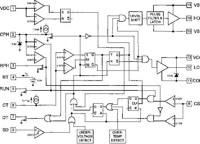 Коррекция коэффициента мощностиУзел коррекции коэффициента мощности состоит из контроллера коэффициента мощности LinFinity Microelectronics LX1562 (IC1), МОП-транзистора M1, индуктивности L3, диода D2, конденсатора C9 и дополнительных чувствительных и управляющих элементов (см. принципиальную схему). Эта микросхема была выбрана из-за минимального количества дополнительных элементов, низкого тока запуска и мощного усилителя сигнала рассогласования. В схеме реализована топология для пошагового повышения и регулирования напряжения на шине постоянного тока при питании синусоидальным током (низкий суммарный коэффициент гармоник), совпадающим по фазе с напряжением питания сети переменного тока (высокий коэффициент мощности). Схема узла коррекции коэффициента мощности взята из технического описания LinFinity Microelectronics LX1562. Там же содержатся описание работы микросхемы LX1562 и советы по конструированию схем с ее использованием. Управление балластомОсновным элементом узла управления балластом является микросхеме управления балластами IR2157 (IC2 на демонстрационной плате). IR2157 содержит генератор, высоковольтный полумостовой драйвер затворов, и схему защиты от неисправности лампы. Блок схема IR2157 изображена на Рис. 1, а ее фазовая диаграмма приведена на Рис. 2. Далее подробно описывается схема организации всех режимов работы балласта.