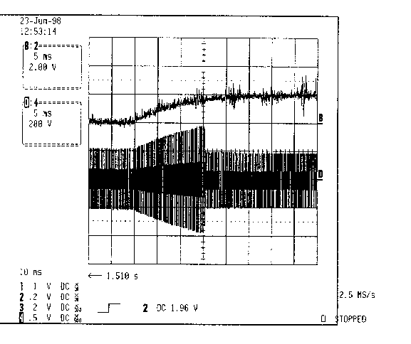Рис. 16. Неудачный поджиг лампы (цепи электродов исправны). Напряжение на лампе в конце режима подогрева и в режиме поджига линейно меняющимся сигналом. |