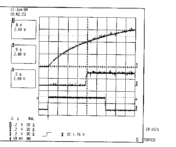 Рис. 14. Нормальный поджиг лампы. Напряжение на лампе в конце режима подогрева, в режиме запуска линейно меняющимся сигналом и начале рабочего режима. |
