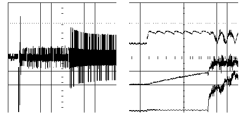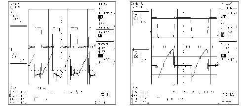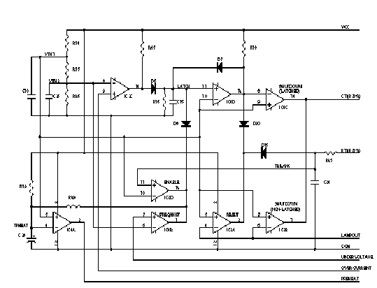Схема защитыСхема защиты включает две ИС счетверенных компараторов (IC2 и IC4), фильтр детектора тока (R21, R22, C16 и D12), схему защиты при замене лампы ( R23, R24, R25, R26, D16 и C22) и датчиков перегрузки по току (R47, R48, R49, R43, R44, R46, D10 и D19). Более подробный чертеж схемы защиты приведен на рис 3. Фильтр детектора тока выпрямляет и интегрирует измеряемый резонансный ток лампы в истоке МОП ПТ нижнего плеча полумоста и сравнивает его с фиксированным пороговым напряжением. Ток должен превысить порог срабатывания в случае токовой перегрузки, обусловленной незажженным состоянием лампы или при ненулевом напряжении переключения полумоста, обусловленным отсутствием контакта или обрывом одного из катодов лампы. В этом случае напряжение на выводе CT ИС IR2153 фиксируется на уровне ниже внутреннего порога срабатывания (1/6 от Vcc) и балласт выключается. В случае замены лампы триггер-защелка обнуляется схемой защиты при замене лампы и напряжение на выводе CT ИС IR2153 удерживается ниже напряжения внутреннего порога срабатывания, но не в "зафиксированном" положении (рис 4). Когда вставлена новая лампа балласт автоматически начинает работать без перезапуска напряжения входной линии. При удалении лампы, частота работы балласта устанавливается на значение частоты режима предварительного подогрева, чтобы избежать выхода из строя ключей полумоста вследствие работы на частоте ниже резонансной , что может случиться в момент установки новой лампы.