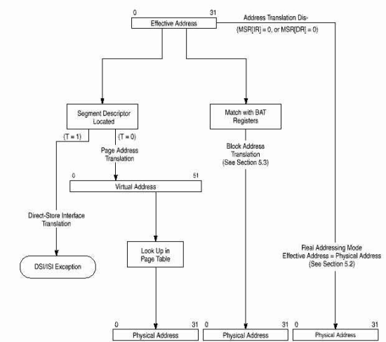 Если работает преобразование адресов, MMU преобразует старшие биты эффективного адреса в физический. Если адрес найден в массиве BAT, то физический адрес выдается сразу, иначе 32-битный эффективный адрес расширяется в 52-битный виртуальный замещением 24 старших битов на сегментный регистр, адресуемый 4 старшими битами ЕА. 52-разрядные виртуальные адреса разделены на 4 Кб страницы, отображаемые в физические. Младшие биты адреса одинаковы и используются для вычисления индекса в массиве тэгов кэша. После преобразования адресов MMU посылает физический адрес в кэш и данные считываются. Если кэш не используется или данных в нем нет, то не преобразованные младшие биты соединяются с преобразованными старшими в 32-разрядный физический адрес, который используется для доступа к внешней памяти.