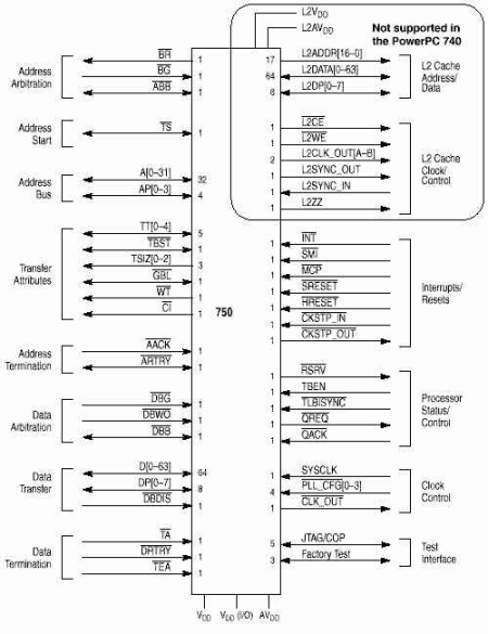 Доступ к системной шине дается через механизм внутреннего арбитража. Обычно доступы к памяти слабо упорядочены - последовательности команд загрузки/записи не обязательно выполнять в порядке их следования - то есть можно максимизировать эффективность использования шины без потери когерентности. 750 позволяет выполнять операции загрузки/записи не в порядке расположения в очереди команд (если нет зависимостей между ними и нет случаев некэшируемых доступов). Процессор 750 имеют следующие группы выводов: