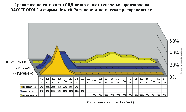 Рис. 3. Сравнение по силе света СИД желтого цвета свечения производства ОАО "ПРОТОН" и фирмы Hewlett Packard (статическое распределение)
