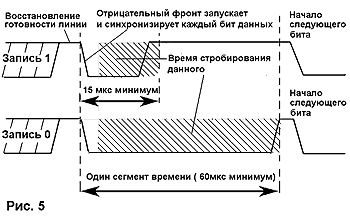 Длинные или короткие активные состояния логического нуля во временных сегментах представляют единицы или нули. Ведущая система запускает передачу каждого бита.