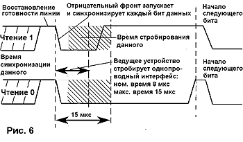В цикле считывания идеальный момент стробирования считываемого данного - это 8мкс после начала временного сегмента (Рис 6). Задающее устройство подает на однопроводную линию активный логический 0 на время синхронизации данного (не менее 1мкс), после чего переходит в режим приема. Далее в течение всего времени выборки данного состояние линии определяется прибором iButton . После начала временного сегмента состояние линии с помощью пассивной нагрузки выдерживается на уровне логической 1 от 15 до 60мкс. Возможна приостановка сеанса связи на любое время между временными сегментами, при этом на однопроводной линии связи поддерживается состояние логической 1. Во всех сеансах связи первым передается младший значащий разряд данного.