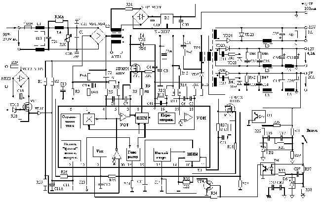 Цепи регулирования и контроля напряжения промежуточной цепи имеют раздельные входы (выводы 17,19). Наличие двух делителей напряжения позволяет изменять порог реакции предела перенапряжения на выходе ККМ относительно номинального промежуточного напряжения от 110% до 105%. Более детальную информацию по ИС TDA16888 можно увидеть на сайте В 2000 году планируется в учебном классе фирмы Infineon на кафедре "Промышленной электроники" Московского энергетического института создание экспериментальных стендов. Здесь специалисты могут получить интересующую их информацию по применению данной ИС и ряда других продуктов фирмы. Это же описание в формате *.pdf можно скачать Тел.: (095) 362-74-22 Приложение 1 Приложение 2 Блок питания персонального компьютера (ПК) с требованием по мощности до 150Вт предлагает диапазон выходов: 5В/18А; 12В/4А; 12В/0,7А; 5В/0,3А; 5В/0,1 А (режим покоя). Обеспечивает применение для электрических сетей всего мира (диапазон входных напряжений от 90 - 270В) и соответствие требованиям МЭК IEC 1000-03 по содержанию высших гармоник в потребляемом токе. Типичные данные для параметров, измеряемые для установленной выходной мощности 150Вт при рабочей частоте 100кГц, приведены в таблице. Особыми моментами являются низкие допуски (разбросы) выходных напряжений при работе от полной нагрузки до ее отсутствия и стабилизированное напряжение промежуточной цепи постоянного тока, даже в режиме ожидания. Блок питания ПК 150Вт обычно монтируется в системный блок ПК. Внешний вид блока питания приведен на рис. 9. |