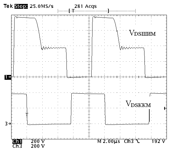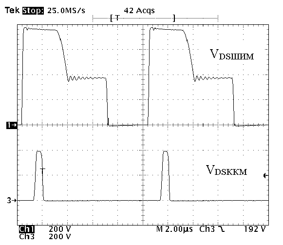 Поляков В.Д., Барышников А.Н. Применение комбинированного контроллера TDA16888 в типовых источниках питанияПредставляем на суд специалистов новую разработку фирмы Infineon Technologies (Siemens) в области источников питания для промышленного применения. Предлагаемая фирмой новая ИС TDA16888 обладает рядом положительных свойств, повышающих надежность и качество электропитания. Данный материал является авторским обзором оригинальных публикаций фирмы-разработчика по данной ИС. 1. Общая характеристикаИнтеграционная схема (ИС) TDA16888 предназначена для новых поколений источников питания с активной коррекцией коэффициента мощности (ККМ), режимом ожидания и широким диапазоном входного напряжения (90 - 270 В), т.е. дл персональных компьютеров, мониторов, телевизоров и промышленного применения. Это совершенное исполнение комбинированного контроллера оптимизировано, чтобы обеспечить электромагнитную совместимость, уменьшить системные затраты, реализовать схемные решения для широкого диапазона применений. ИС разработана по правилам FMEA (эффективного анализа повреждений), которые ставят условием, что простой сбой не должен приводить к неконтролируемым выходам из строя и гарантировать риск от пожара. TDA16888 предназначена для управления двухступенчатой топологией ККМ и ШИМ преобразователи синхронизированы внутренним генератором. Частота генератора устанавливается с помощью внешнего резистора R24, подключенного к выводу 16 и земле. Соответствующий времязадающий конденсатор встроен, чтобы гарантировать низкий ток потребления и высокую устойчивость против электромагнитных помех. Внутренний генератор работает с удвоенной внешней частотой для точного ограничения длительности цикла ШИМ (50%) при помощи триггера (рис.3). ККМ работает с максимальной длительностью цикла 94%, чтобы получить минимальные паузы потребляемого тока. Генератор может быть синхронизирован с внешним задающим сигналом, поданным на вывод 12. ККМ преобразователь имеет мультисхемное управление. При нормальной работе ККМ-схемы TDA16888 работает с двойной цепью управления. Первая цепь отслеживает форму потребляемого тока, обеспечивая средне токовый режим управления, как в режиме непрерывного, так и прерывистого тока. Вторая цепь стабилизирует напряжение в промежуточной цепи постоянного тока. Сигнал обратной связи по напряжению с делителя R13, R14 поступает на вход 17 микросхемы. Выходной сигнал усилителя ошибки на выводе 18 умножается с током на выводе 1, полученным при помощи RCR фильтра (на резисторах R4A, R4B и конденсаторе С9) из выпрямленного входного напряжения. Ток выхода умножителя формируется подобно входному напряжению, а его амплитуда изменяется в зависимости от выходного напряжения усилителя ошибки напряжения. Ток, пропорциональный потребляемому, поступает на вход усилителя ошибки тока (вывод 4 ИС), где вычитается из тока выхода умножителя. Выходное напряжение усилителя ошибки тока (выход 3 ИС) поступает на широтно-импульсный модулятор, где сравнивается с пилообразным напряжением, поступающим с выхода генератора (рис. 3). Выходной каскад широтно-импульсного модулятора (драйвер ККМ) формирует на выводе 8 ИС напряжение управления силовым транзистором VT1. Для частотной коррекции в цепи обратной связи усилителя ошибки тока включены элементы С7, С8, R8 а в цепи обратной связи усилителя ошибки