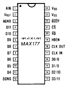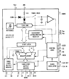 ИС MAX177 является законченным, CMOS, 10-ти разрядным аналого- цифровым преобразователем (АЦП), который сочетает в себе встроенную систему выборки/фиксации, высокое быстродействие, низкое энергопотребление, встроенный источник опорного напряжения (ИОН). Время преобразования составляет 8.33 мкс и включает в себя время установки сигнала для системы выборки/фиксации. Встроенный ИОН типа «buried zener» обеспечивает низкий уровень дрейфа и шума опорного напряжения.